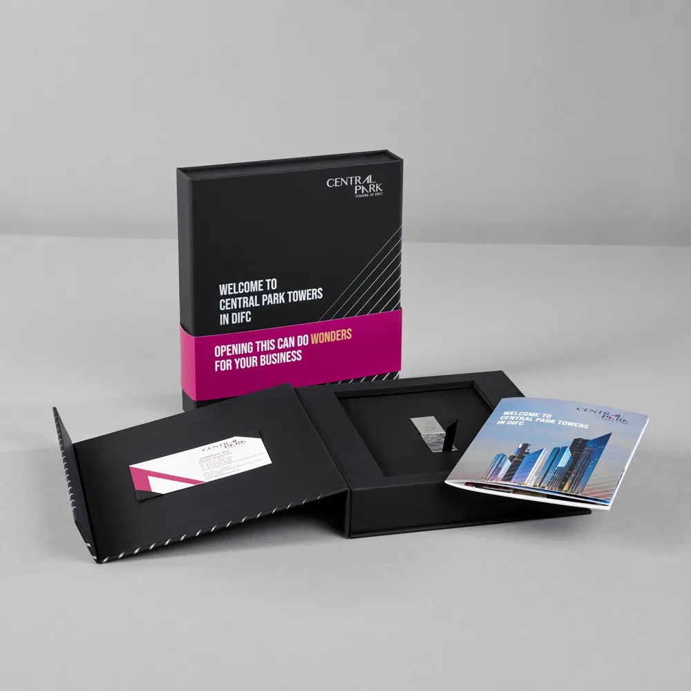 Central Park Towers is a premium commercial development in DIFC, featuring 52 floors of office space along with multiple retail podiums. Arady Development required a bespoke handover box to present to companies and retailers upon leasing their units. The box needed to house a parking card, a hard-copy tower manual, and a USB drive containing digital documents. The design had to align with the tower’s upscale brand, feeling premium, professional, and durable.
