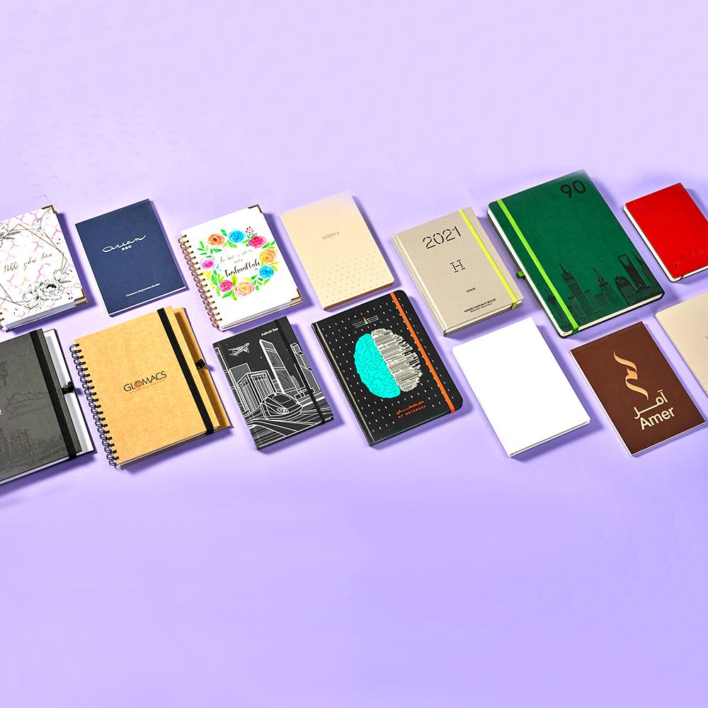 - Notepads: A5 size with top glue, featuring branded pages and 100 gsm woodfree paper.